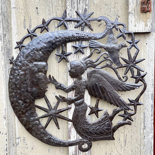 Home Decor Angel, Handmade in Haiti from Recycled Steel Drum Barrels, Celestial Wall Art 11" Round