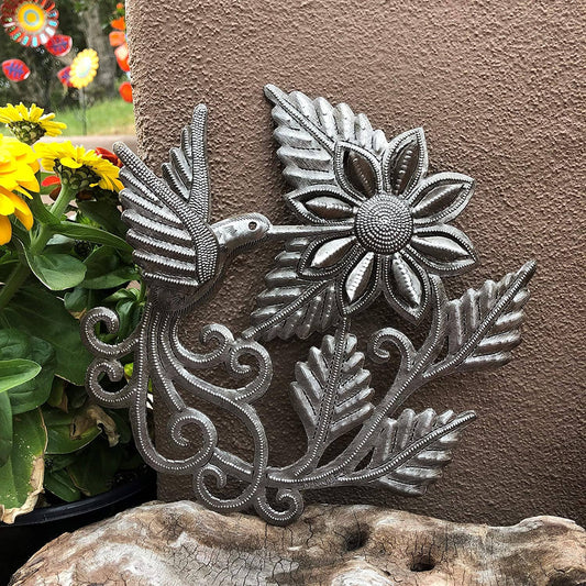 11" Blooming Flower with Hummingbird Haitian Metal Wall Art Indoor Outdoor Decorative