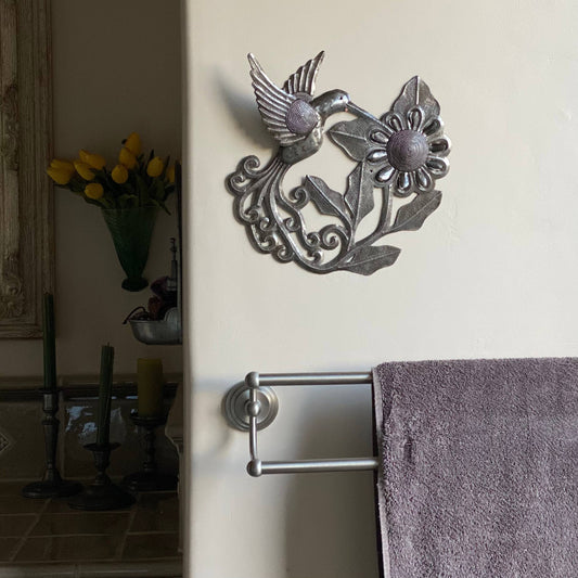 Hummingbird and a Flower, Garden Metal Wall Hanging Plaques 7" x 8" Handmade in Haiti